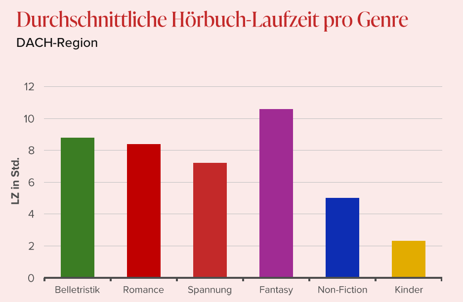 Die Zahl digitaler Neuveröffentlichungen in DACH wuchs 2025 deutlich auf etwa 14.900 Titel (2024: 13.500). Parallel dazu verlängerten sich die Laufzeiten – im Durchschnitt 6,6 Stunden pro Produkt (2024: 6,3), klassische Hörbücher blieben bei 7,2 Stunden, Hörspiele stiegen auf 2,6 Stunden (2024: 2,4). Der serielle Anteil legte weiter zu und erreichte 36 Prozent (2024: 35), getrieben vor allem von Romance, Spannung und Fantasy. Kinder- und Non-Fiction-Formate zeigten hingegen rückläufige serielle Anteile.